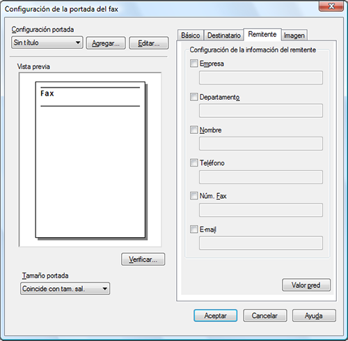 6. Introduzca la información del remitente en la ficha [Remitente] (utilizando 80 caracteres como máximo para cada entrada).