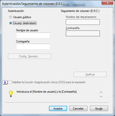 2. Con la autenticación de usuario activada, seleccione [Usuario destinatario] y, a continuación, introduzca el nombre de usuario y la contraseña.