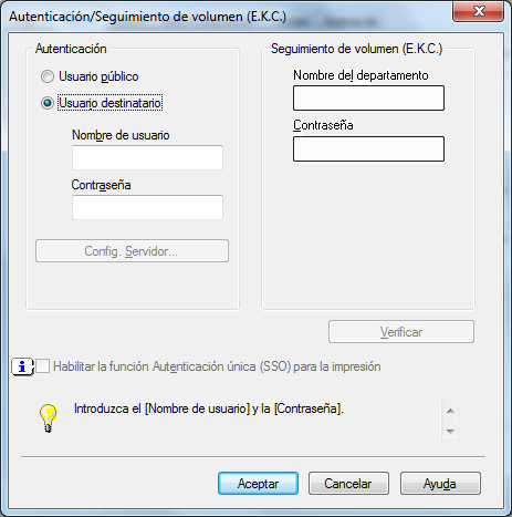 • Si no está definida correctamente, seleccione [Autenticación] o [Seguimiento volumen (E.K.C.)] en la lista y, a continuación, cambie la configuración correspondiente en [Config.].