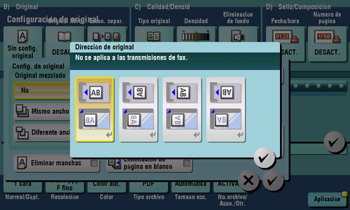 [Resolución fax] | Seleccione la resolución empleada para enviar un fax. Cuando utilice una transmisión de fax, una transmisión de fax por Internet o una transmisión de fax por dirección IP, seleccione las siguientes resoluciones para escanear un original.