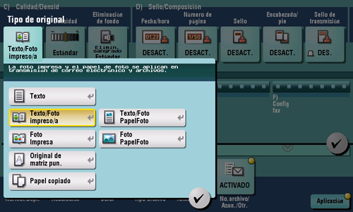 [Texto/Foto impreso/a] | Toque este botón para escanear un original que contiene texto y fotos al nivel óptimo de calidad de imagen. Defina los bordes del texto y suavice las fotos. Seleccione esta opción para escanear originales impresos como, por ejemplo, folletos y catálogos. |