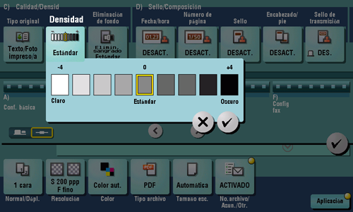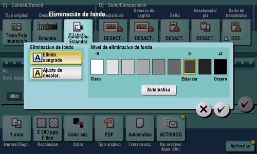 [Nivel de eliminación de fondo] | Toque este botón para ajustar la densidad del color de fondo de un original con el fondo en color. Seleccionando [Automática] se determinará automáticamente la densidad del color de fondo y se escaneará el original al nivel óptimo de densidad de fondo. |