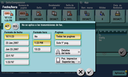 Seleccione la posición y representación del sello, y añada la fecha y la hora de escaneado del original. La fecha y hora pueden imprimirse en todas las páginas o únicamente en la primera.