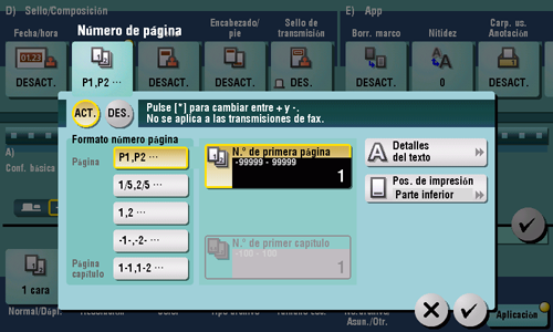[N.º de primera página] | Para imprimir en la primera página, introduzca el número de la primera página con el teclado. Para mostrar el teclado, toque el área de entrada numérica. Por ejemplo, para imprimir números de página desde la tercera página del original, introduzca "-1". La primera página del original cuenta como "-1", la segunda página cuenta como "0" y la tercera página cuenta como "1". En [Nº de primera página], se imprime un número de página en la página 1 y siguientes. Si introduce "2", los números de página se imprimen desde la primera página del original como "2, 3", etc., en orden. El "-" (signo menos) cambia a + cada vez que se toca [*]. |