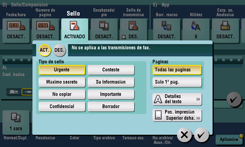 El texto como, por ejemplo, "Conteste" y "No copiar" se imprime en la primera página o en todas las páginas. Es posible seleccionar el texto que se debe añadir desde los sellos fijos registrados y los sellos registrados arbitrarios.