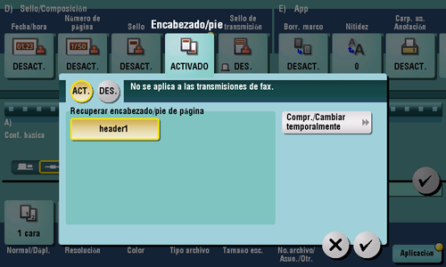 [Compr./Cambiar temporalmente] | Si es necesario, compruebe o cambie temporalmente los detalles del programa seleccionado en [Recuperar encabezado/pie de página].