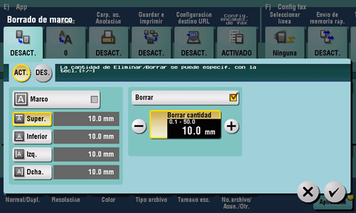 [Super.]/[Inferior]/[Izq.]/[Dcha.] | Seleccione esta opción para borrar los cuatro lados del original a diferentes anchos. Desactive la casilla [Marco], seleccione un lado ([Super.], [Inferior], [Izq.] o [Dcha.]) y especifique la anchura del área en [Borrar cantidad] tocando [+]/[-] para un área de pulgadas y tocando [+]/[-] o el teclado para un área de centímetros. Para mostrar el teclado, toque el área de entrada numérica. Si no desea borrar el lado, cancele la configuración de [Borrar]. |