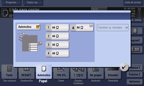 [1] - [4] | Toque este botón para especificar el papel cargado en cualquiera de las bandejas de Bandeja 1 a Bandeja 4 y realice una copia. |