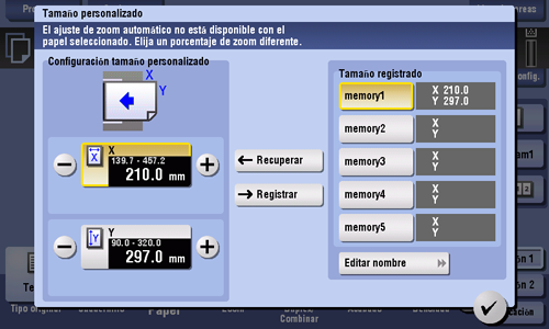 [Configuración tamaño personalizado] | Para el área de pulgadas, toque [+]/[-] para especificar el largo (X) y el ancho (Y) del papel. Después de haber especificado el tamaño, seleccione una tecla ([memory1] a [memory5]) en [Tamaño registrado], y toque [Registrar]. A continuación, el tamaño que usted ha especificado, se registra en la memoria. Puede recuperar el tamaño registrado en el futuro. |