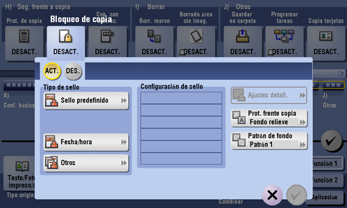 [Tipo de protección de copia] | Seleccione un sello utilizado. También pueden imprimirse la fecha y hora.