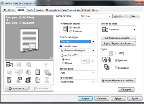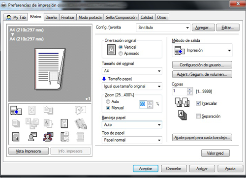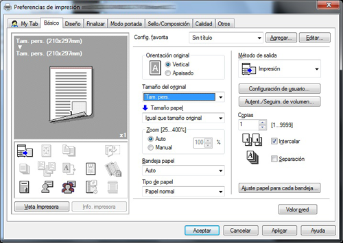 En [Tamaño papel] en la ficha [Básico], seleccione el tamaño de papel que debe utilizarse para la impresión. El porcentaje de escala se determina de forma automática por los tamaños de papel seleccionados en [Tamaño del original] y [Tamaño papel].
