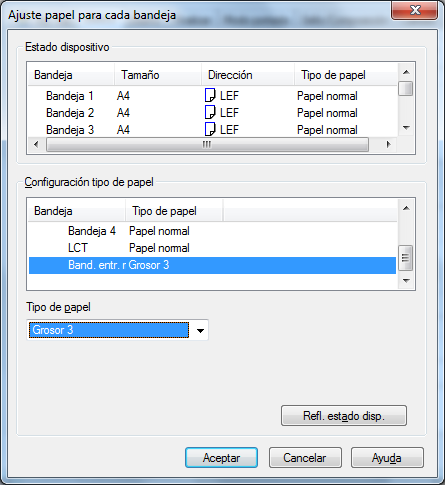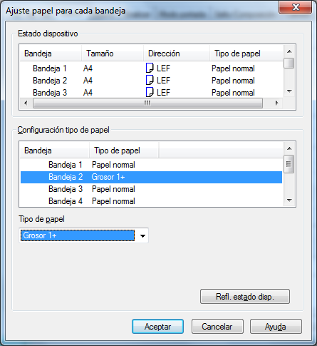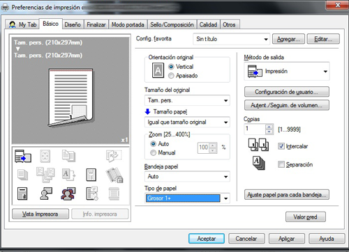 En [Ajuste papel para cada bandeja...] en la ficha [Básico], puede definir el tipo de papel para cada bandeja. Al especificar una función distinta de [Auto] en [Bandeja papel], la información del tipo de papel se especifica aquí.