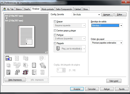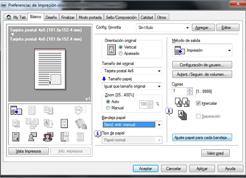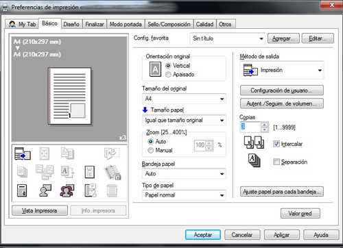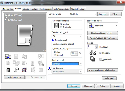 En [Bandeja papel], en la ficha [Básico], seleccione la bandeja de papel que debe utilizarse para la impresión.
