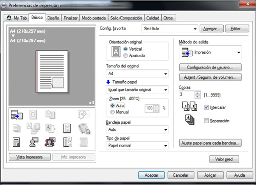 En [Bandeja papel], en la ficha [Básico], seleccione la bandeja de papel para imprimir el original.