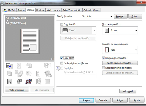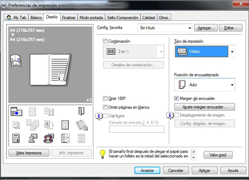 En [Tipo de impresión], en la ficha [Diseño], seleccione [2 caras]. [2 cara] es la opción predeterminada.