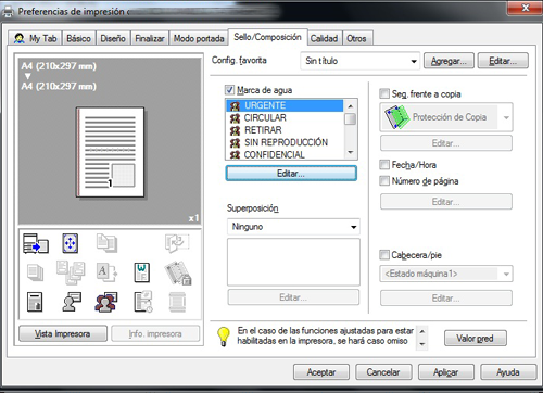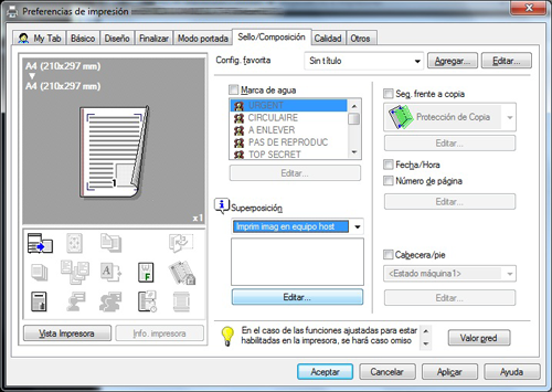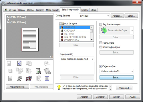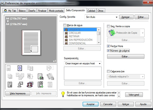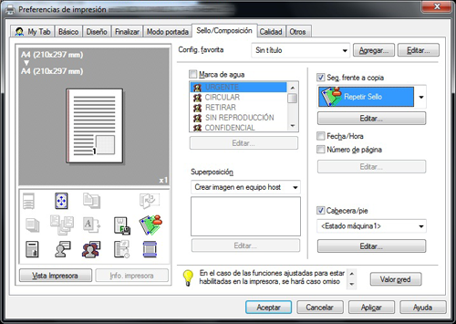 Sellos como, por ejemplo, "Copia" y "Private" se imprimen en toda la página.