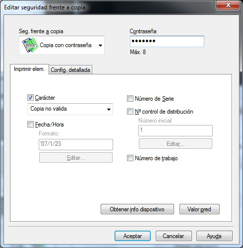 Copia con contraseña es una función de protección de copia que imprime marcas de agua de seguridad ocultas tales como "Privado" o una fecha en el fondo para evitar que se realicen copias no autorizadas e incrusta una contraseña para la función de copia con contraseña en todas las páginas impresas.