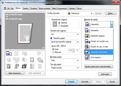 En [Método de salida] en la ficha [Básico], seleccione [Impresión de prueba].