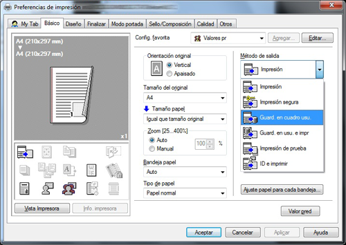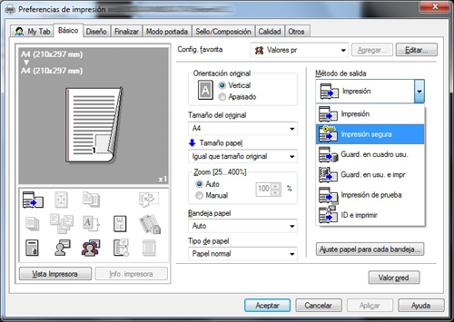 En [Método de salida] en la ficha [Básico], seleccione [Impresión segura].