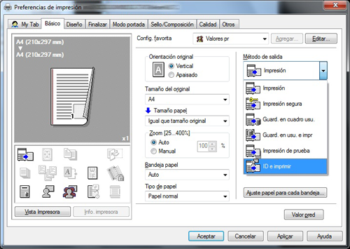 Si [ID e impresión] se ajusta en [ACT.] en [Configuración ID e impresión], una tarea de impresión se considerará una tarea de ID e impresión incluso si el [Método de salida] se ha ajustado en [Imprimir] para el controlador de impresora (predeterminado: [DES.]). Para obtener más información sobre [Configuración ID e impresión], consulte Aquí.