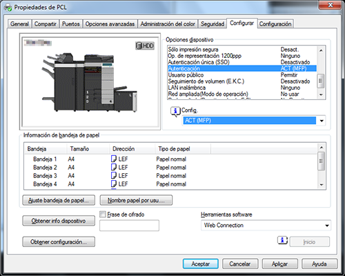 En [Opciones dispositivo] en la ficha [Configurar], compruebe que la configuración de autenticación/seguimiento de volumen esté definida correctamente para su entorno operativo.