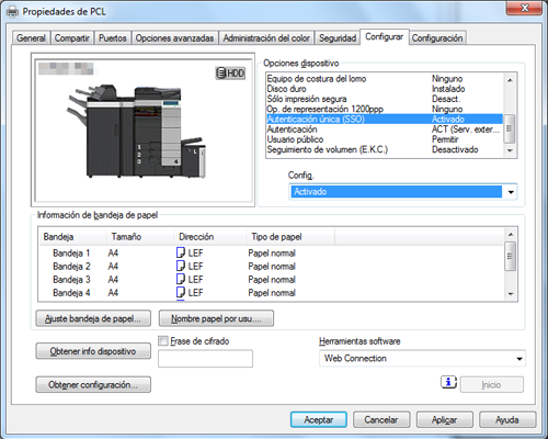 En [Opciones dispositivo] en la ficha [Configurar], compruebe que la [Autenticación] y la configuración de la [Autenticación única (SSO)] estén definidas correctamente para su entorno operativo.