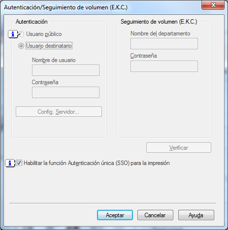 Si no está definida correctamente, seleccione [Autenticación] o [Seguimiento volumen (E.K.C.)] en la lista y, a continuación, cambie la configuración correspondiente en [Config.].