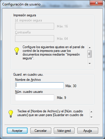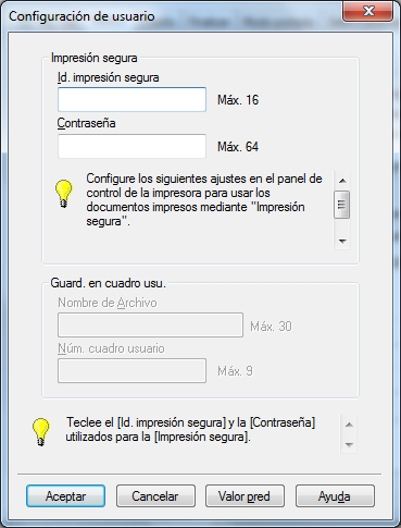 Los datos impresos mediante la función Impresión segura se guardan en la carpeta de usuario de impresión segura. Para imprimir los datos guardados, debe introducir el ID de usu. y contraseña especificados en el controlador de impresora.
