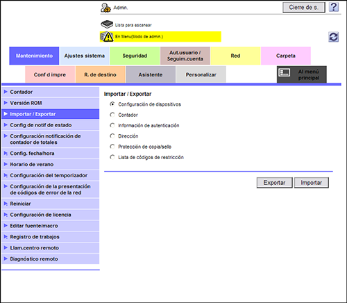 En el modo Administrador, seleccione [Mantenimiento] - [Importar / Exportar] para seleccionar la información que se va a importar y, a continuación, haga clic en [Importar].