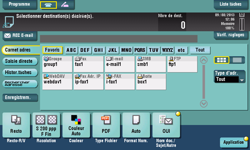 Tapez sur [Vérif. réglages] avant l'émission, et vérifiez la destination et les réglages selon les besoins.