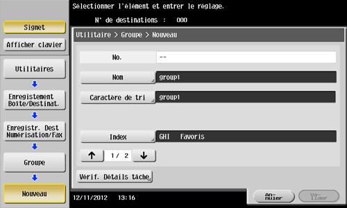 Tapez sur [Utilitaire] - [Enregistrement 1-Touche /Boîte] - [Enregistr. Dest Numérisation/Fax] - [Groupe] - [Nouveau].