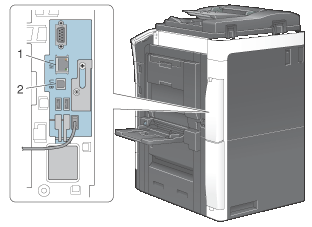 2 | Porta USB | Collegare un cavo USB quando si usa la macchina come dispositivo con collegamento USB. Utilizzare cavi USB di tipo A (maschio a 4 pin) o di tipo B (maschio a 4 pin). Si raccomanda l'utilizzo di un cavo USB con una lunghezza fino a tre metri. |