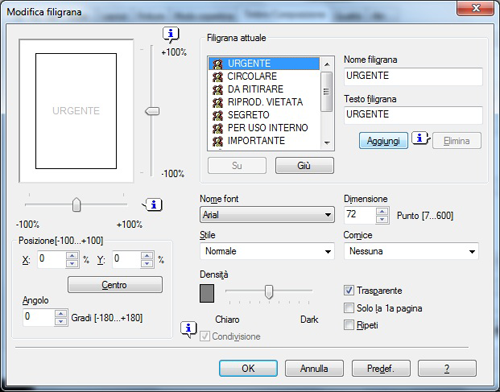 [Trasparente] | Selezionare questa casella di controllo per stampare la filigrana in una tonalità translucente. Quando questa casella di controllo è deselezionata, la filigrana stampata oscura lo sfondo. |