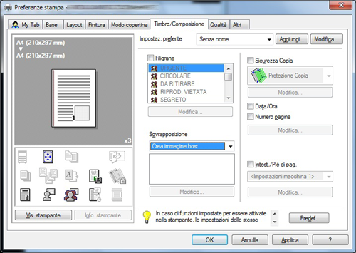 In [Sovrapposizione] nella scheda [Timbro/Composizione], selezionare [Stampa immagine host] o [Stampa immagine periferica] (solo PCL), quindi nell'elenco selezionare l'immagine sovrapposizione da stampare sull'originale come immagine composita.