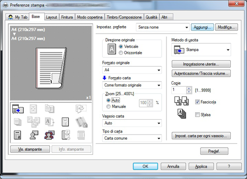 Nella scheda [Base] è possibile configurare le impostazioni di base sulla carta o la stampa. Le funzioni utilizzate di frequente nella stampa normale sono situate in questa scheda.