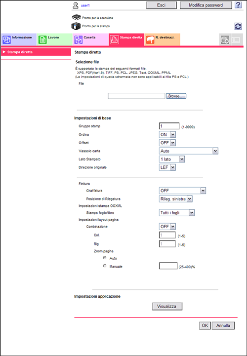 Connettersi a Web Connection utilizzando un browser di rete, quindi specificare il file da stampare. È possibile stampare file di formato PDF (Ver.1.6), JPEG, TIFF, XPS, PS, PCL, Testo, OOXML (.docx/.xlsx/.pptx) e PPML (.ppml/.vdx/.zip).