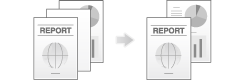Qui di seguito è descritto il flusso operativo in cui diversi originali 1 lato vengono copiati, due pagine sono ridotte nella stessa facciata di una pagina e stampate su entrambi i lati della carta.