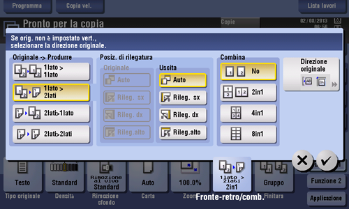 Per gli originali 2 lati, selezionare [2lati>1lato] o [2lati>2lati]. Selezionare un tasto arbitrario secondo la condizione dell'originale e il risultato di copia.