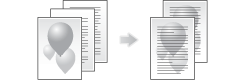 L'immagine originale scansionata nella prima pagina viene sovrapposta agli originali scansionati nella pagine successive. L'originale da scansionare nella prima pagina viene usato per l'immagine sovrapposizione. Per esempio, se si copiano tre pagine originali, sono prodotte due pagine, compresa "un'immagine unita della prima e seconda pagina" e "un'immagine unita della prima e della terza pagina". La funzione Sovrapposizione è utile per la sovrapposizione di testo, fotografie o immagini non preparata nelle altre funzioni Timbro sull'originale.