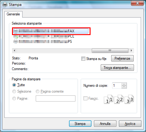 Verificare che il driver fax della macchina sia stato selezionato in [Nome stampante] (oppure [Seleziona stampante]).