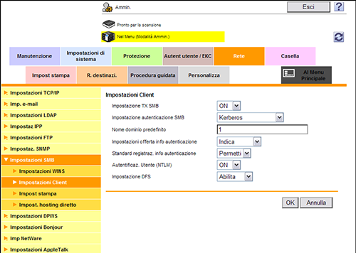 Nel modo amministratore, selezionare [Rete] - [Impostazioni SMB] - [Impostazioni Client], quindi configurare le seguenti impostazioni.