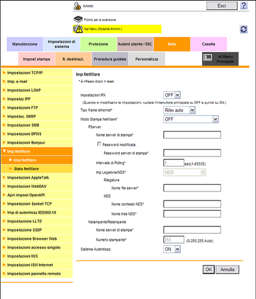 Nel modo amministratore, selezionare [Rete] - [Imp NetWare] - [Imp NetWare], quindi configurare le seguenti impostazioni.