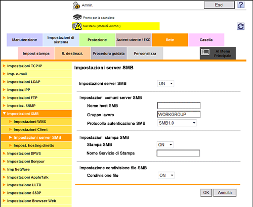 Nel modo amministratore, selezionare [Rete] - [Impostazioni SMB] - [Impostazioni server SMB], quindi configurare le seguenti impostazioni.