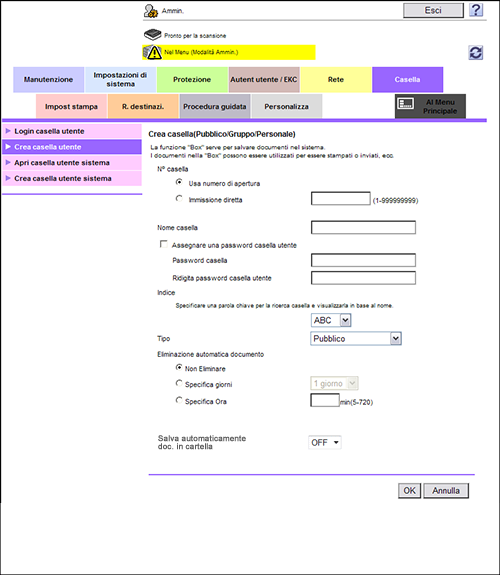 Nel modo amministratore, selezionare [Casella] - [Crea casella utente], quindi configurare le seguenti impostazioni.