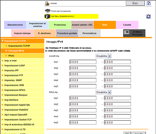 Nel modo amministratore, selezionare [Rete] - [Impostazioni TCP/IP] - [Filtraggio IPv4], quindi configurare le seguenti impostazioni.