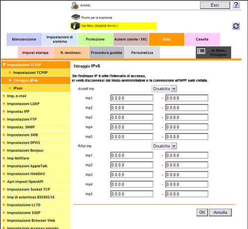 Nel modo amministratore, selezionare [Rete] - [Impostazioni TCP/IP] - [Filtraggio IPv6], quindi configurare le seguenti impostazioni.