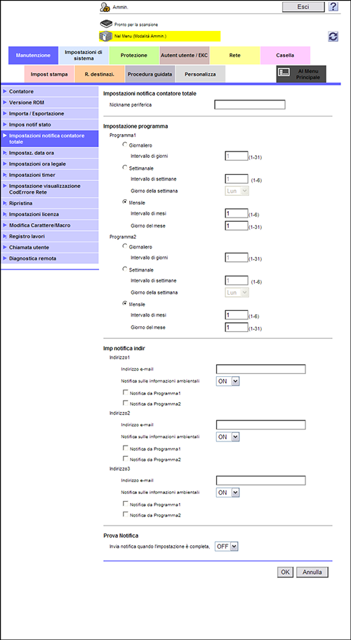 Nel modo amministratore, selezionare [Manutenzione] - [Impostazioni notifica contatore totale], quindi configurare le seguenti impostazioni.
