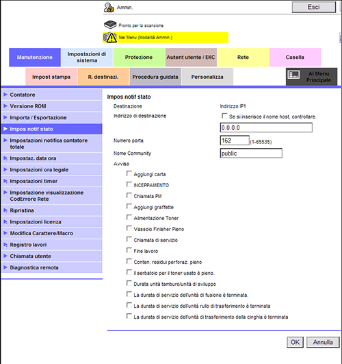 Per informare in merito allo stato della macchina utilizzando la funzione SNMP TRAP, selezionare nel modo amministratore [Manutenzione] - [Impos notif stato] - [Indirizzo IP] o [Indirizzi IPX] - [Modifica], quindi configurare le seguenti impostazioni.