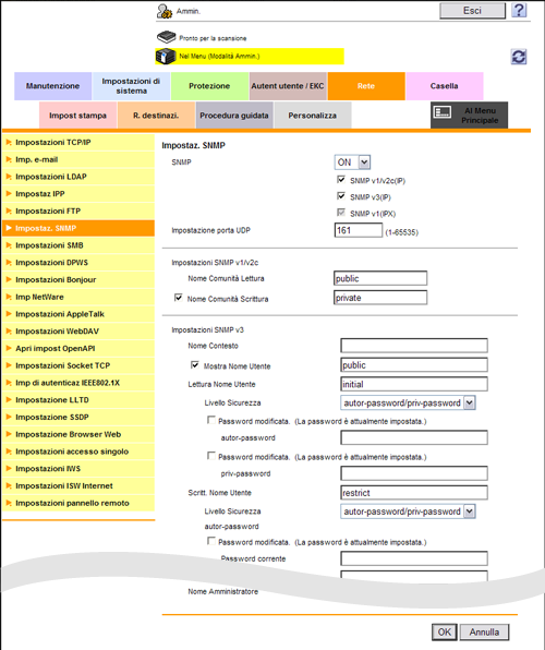 Per gestire la macchina via SNMP, attuare la procedura seguente per configurare le impostazioni.