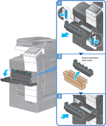 L'addetto all'assistenza provvederà al recupero del contenitore toner usato utilizzato. Chiuderlo con il coperchio e immagazzinarlo in una scatola.